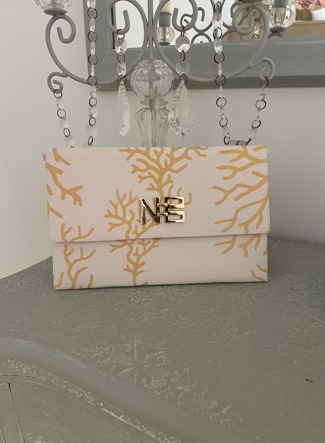 Bolso en un jacquard súper original con tonos beig y dorados.