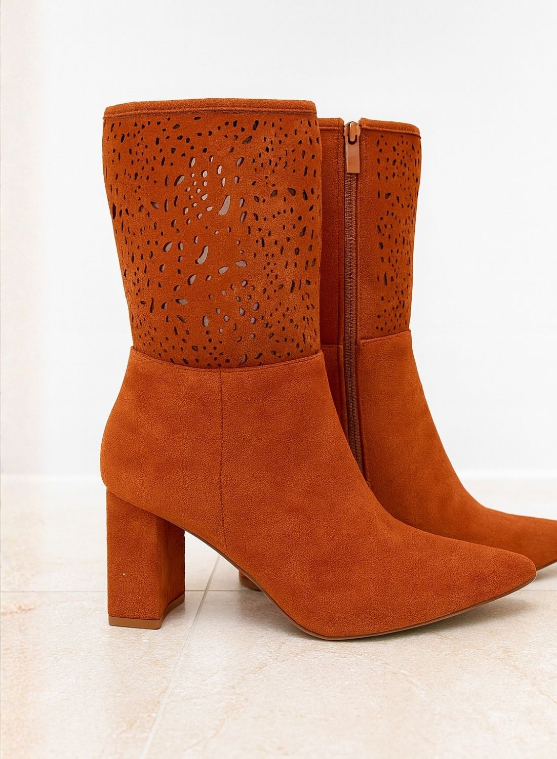 Las botas caldera de ante troquelado Nuribel destacan por su diseño original y favorecedor. Su color cálido y elegante combina con vestidos, faldas y vaqueros, aportando un toque moderno y sofisticado a cualquier look.