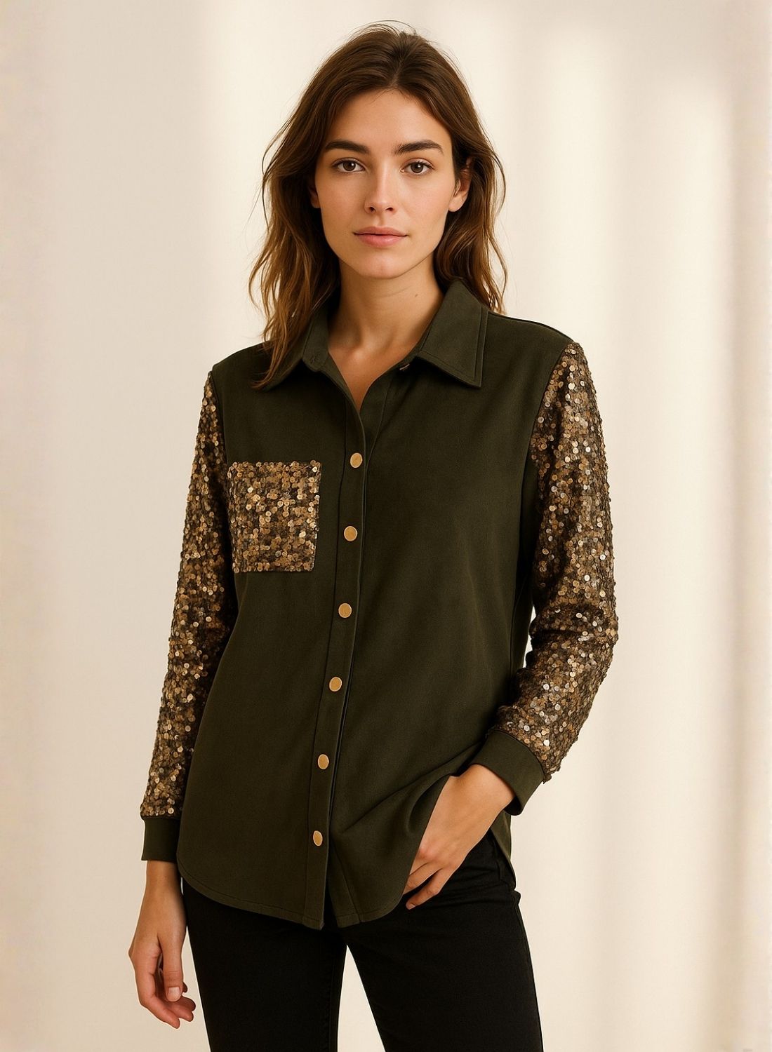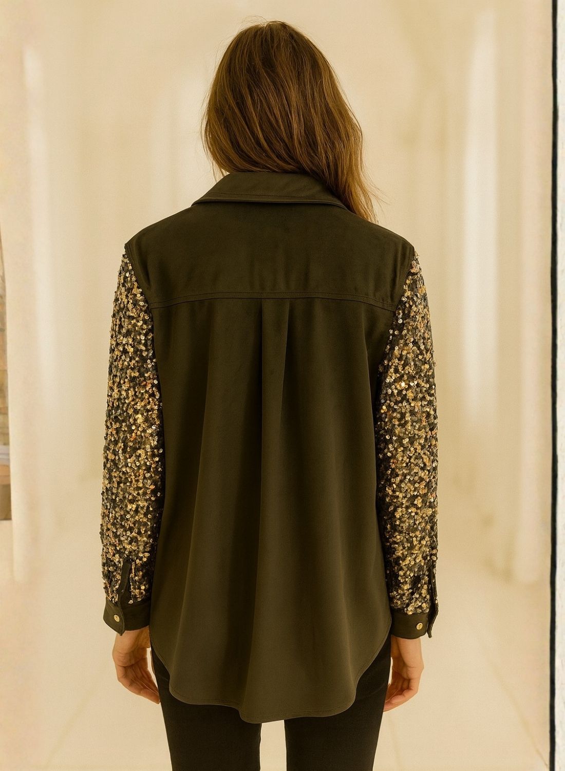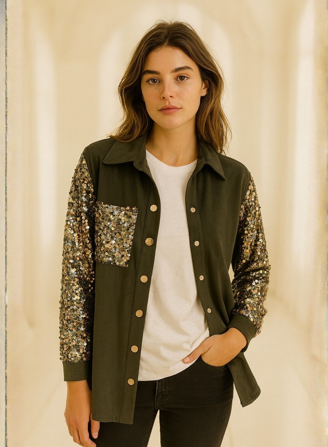 Eleva tus looks de fiesta con esta sobrecamisa de antelina verde combinada con lentejuelas en tonos dorados y verdes, una prenda original y sofisticada pensada para destacar esta temporada. Su diseño fusiona la suavidad y elegancia de la antelina con el brillo sutil de las lentejuelas, logrando el equilibrio perfecto entre tendencia y estilo.
