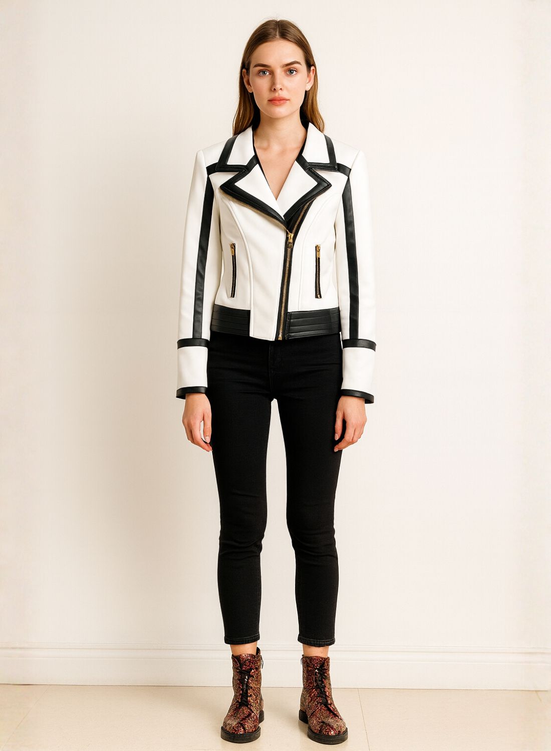 Chaqueta corta en polipiel combinada. Un diseño original para tus días de otoño invierno.