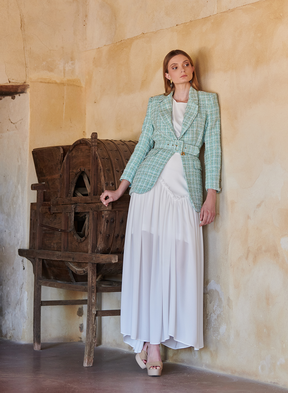 Esta chaqueta estructurada, con hombros definidos y cinturón entallado, realza la figura sin perder comodidad. Su tono pastel ,fresco, luminoso y muy favorecedor, aporta un aire primaveral perfecto para las comuniones y celebraciones diurnas.