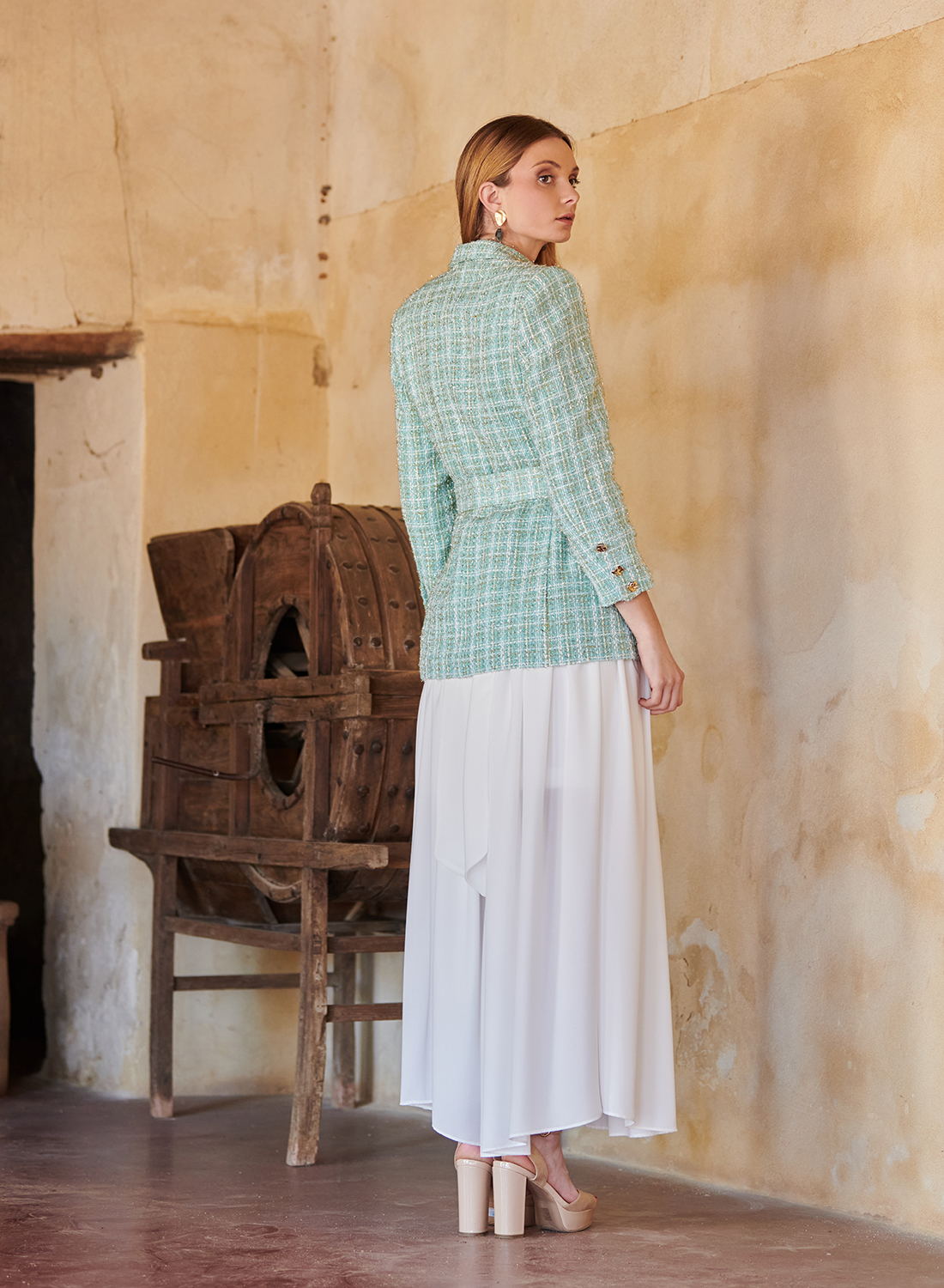 Nuestra chaqueta estilo Chanel en tejido tweed verde agua es la aliada ideal para una mamá de comunión. Su diseño combina elegancia, modernidad y un aire atemporal que la convierte en una pieza imprescindible en cualquier armario de eventos de día.
