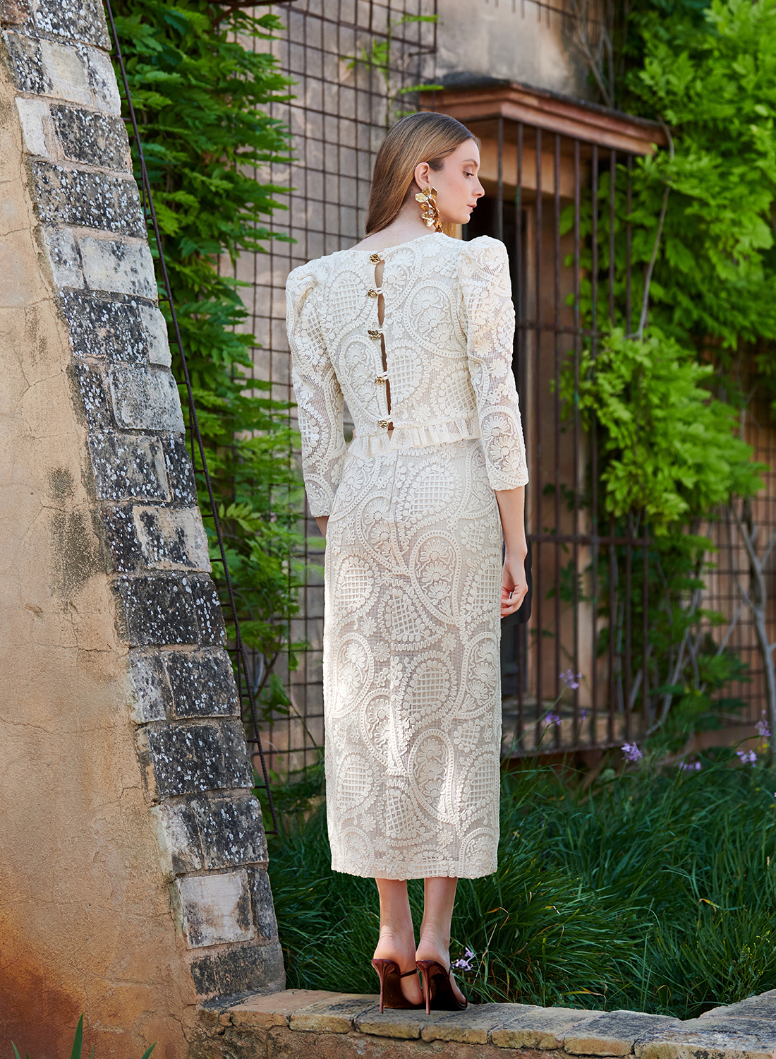 La parte superior presenta un top bordado con manga francesa, hombros ligeramente estructurados y detalle de botones joya en la espalda. Su diseño recto, delicado y femenino se adapta con suavidad a la figura, creando una silueta estilizada. La parte inferior, una falda midi entallada, realza la figura y culmina con un precioso volante bordado que añade un toque romántico y sofisticado.