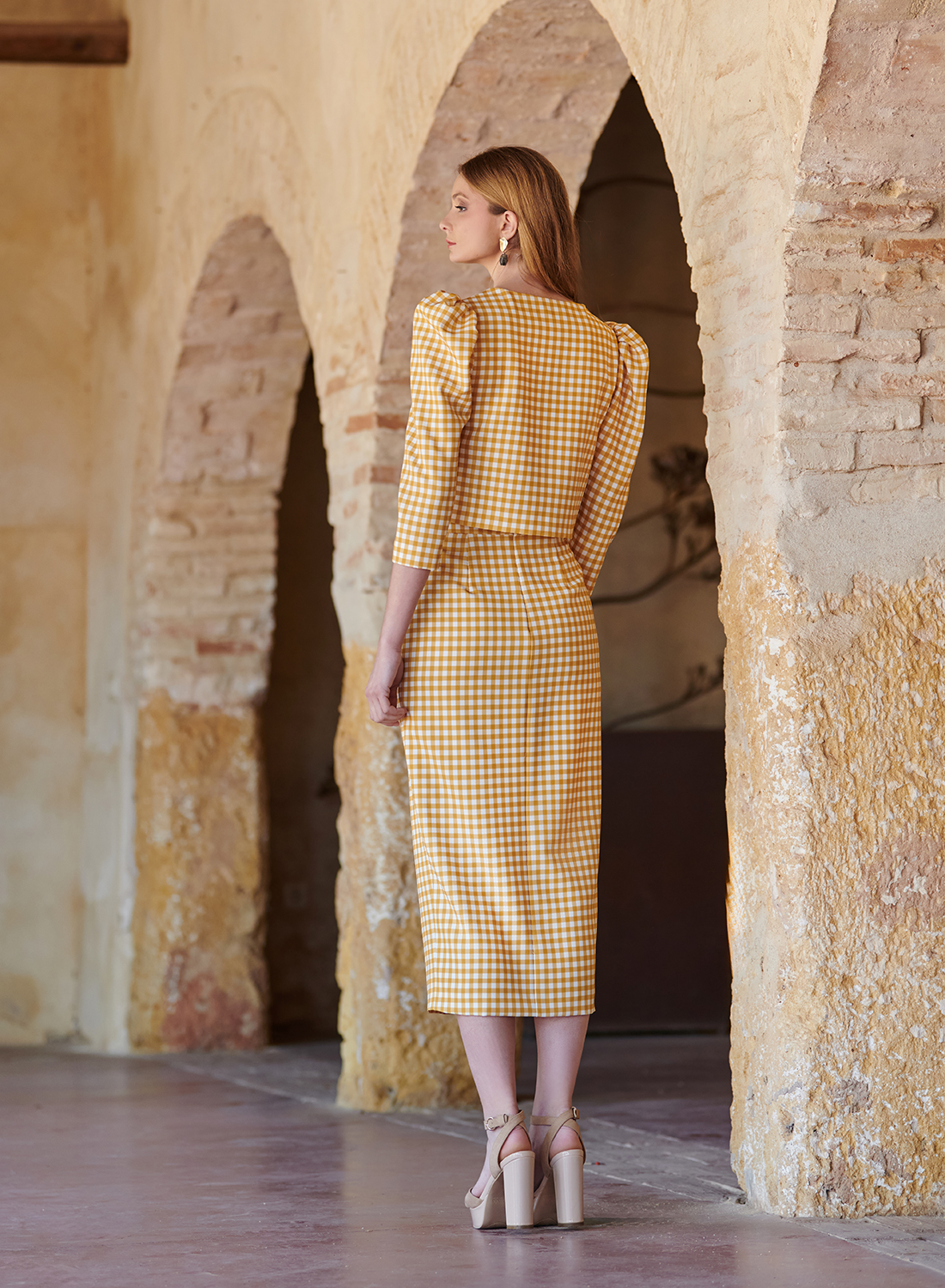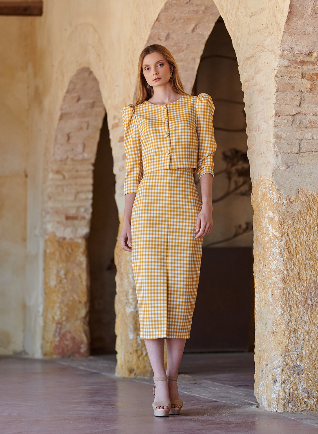 Si buscas un look diferente, elegante y perfecto para los eventos de día, este conjunto de top y falda midi en cuadros blancos y ocre se convertirá en tu nueva elección favorita. Su diseño impecable combina un patrón clásico y atemporal con detalles muy actuales que aportan frescura y estilo.