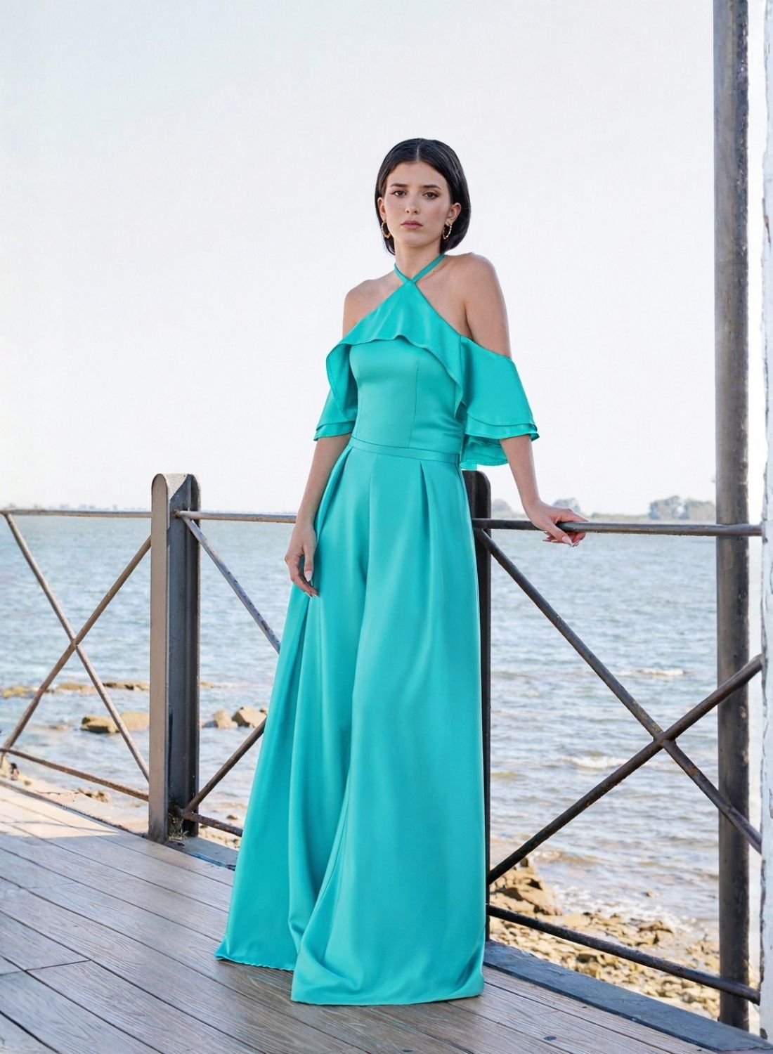 Este conjunto de dos piezas en satén es la opción perfecta para invitadas jóvenes que buscan un look diferente, original y muy sofisticado. Su diseño destaca por su blusa con escote halter y hombros al descubierto, adornada con volantes que aportan movimiento y feminidad. El pantalón palazzo de talle alto estiliza la figura y crea un efecto de falda fluida, aportando comodidad sin renunciar a la elegancia.