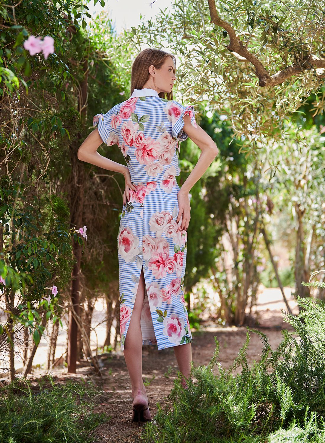 Este diseño destaca por su combinación de cuadro vichy azul y blanco con un elegante estampado de flores en tonos rosas, creando un look romántico, fresco y sofisticado. El top, con cuello camisero y mangas con volantes, aporta un aire juvenil y muy favorecedor. La falda midi recta incorpora una abertura trasera que estiliza la figura y facilita el movimiento, logrando un conjunto equilibrado y lleno de estilo.