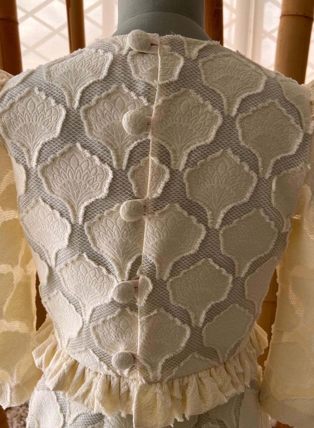 Bordado en relieve con motivos orgánicos que aportan profundidad