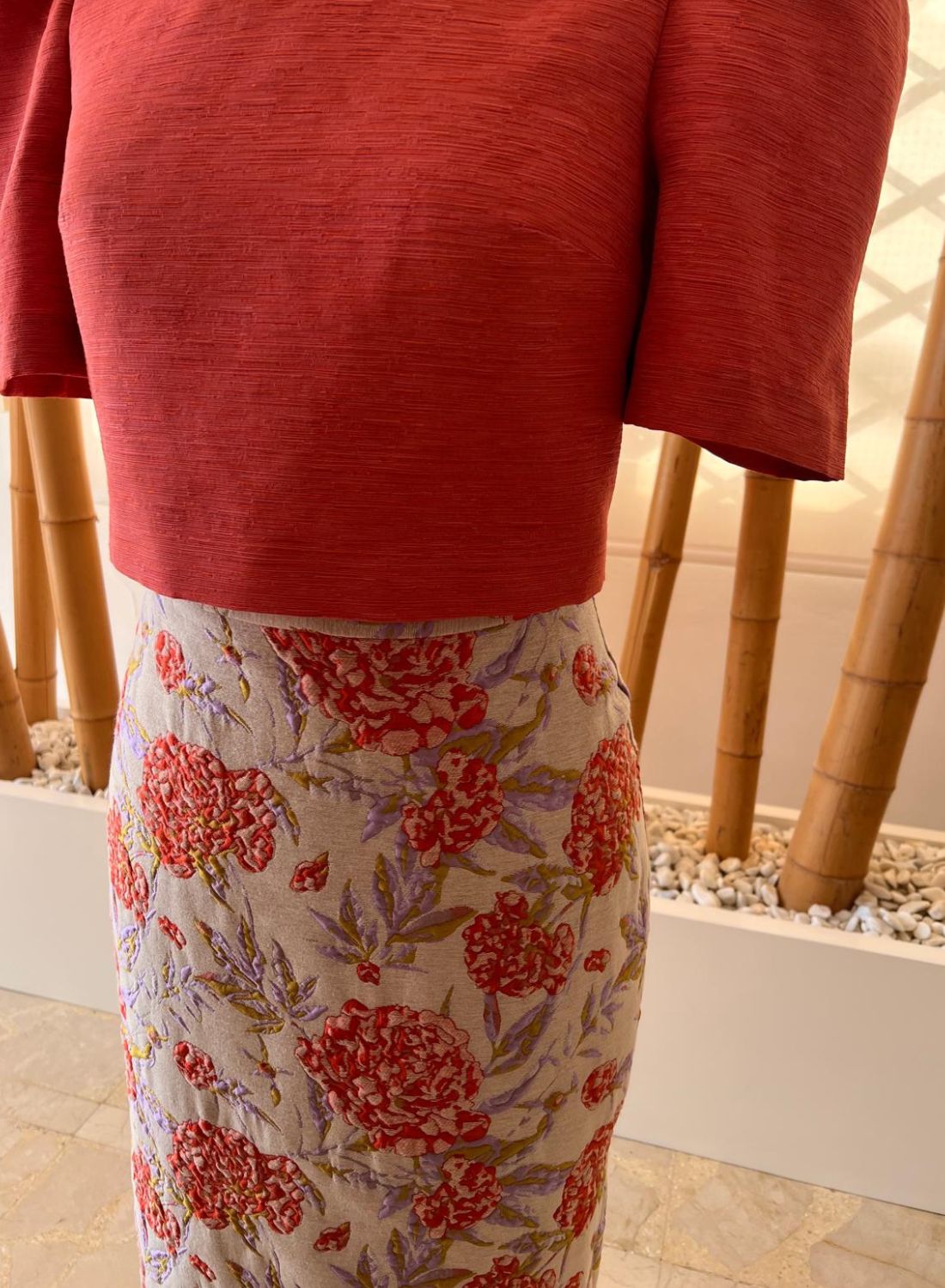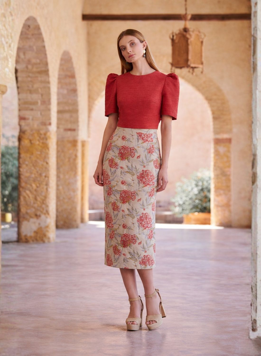 Nuestra falda midi de corte recto es la elección perfecta para mujeres que buscan un look elegante y actual para comuniones y eventos de día. Confeccionada en un delicado tejido floral, destaca por su diseño femenino, sofisticado y muy favorecedor.