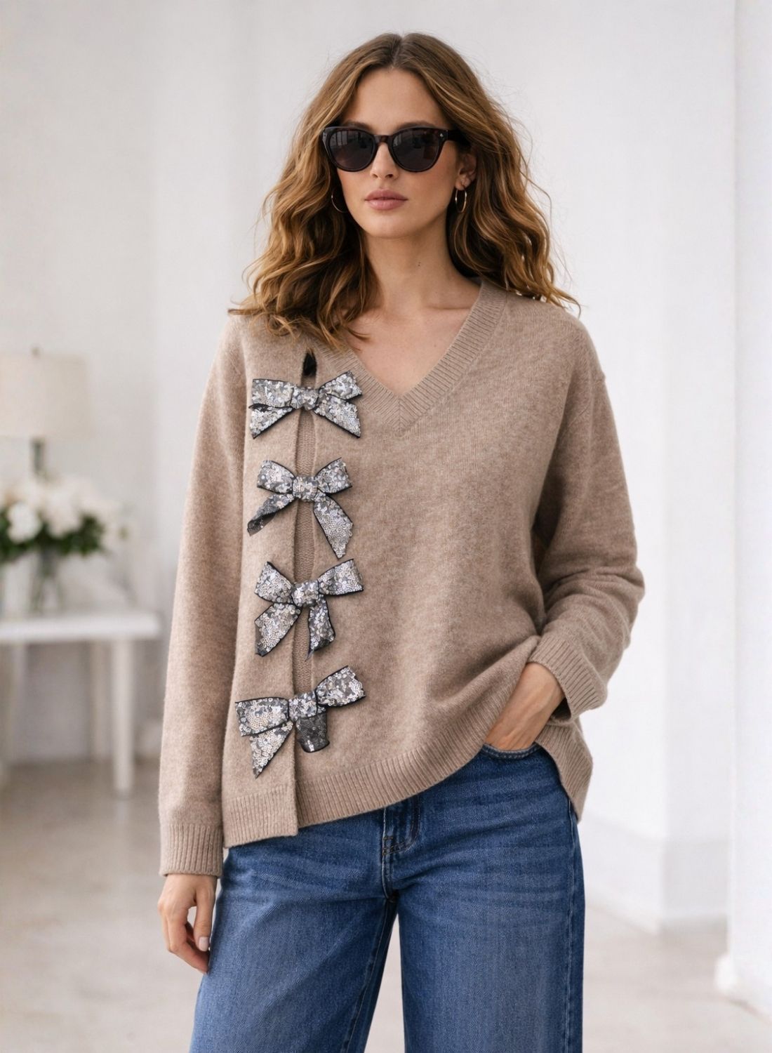 El detalle protagonista son sus lazos joya laterales, elaborados en un tejido con brillo sutil que aporta un aire chic y femenino sin perder versatilidad. Su corte relajado lo hace ideal tanto para looks casuales con vaqueros como para estilismos más cuidados combinados con pantalones de vestir o faldas.