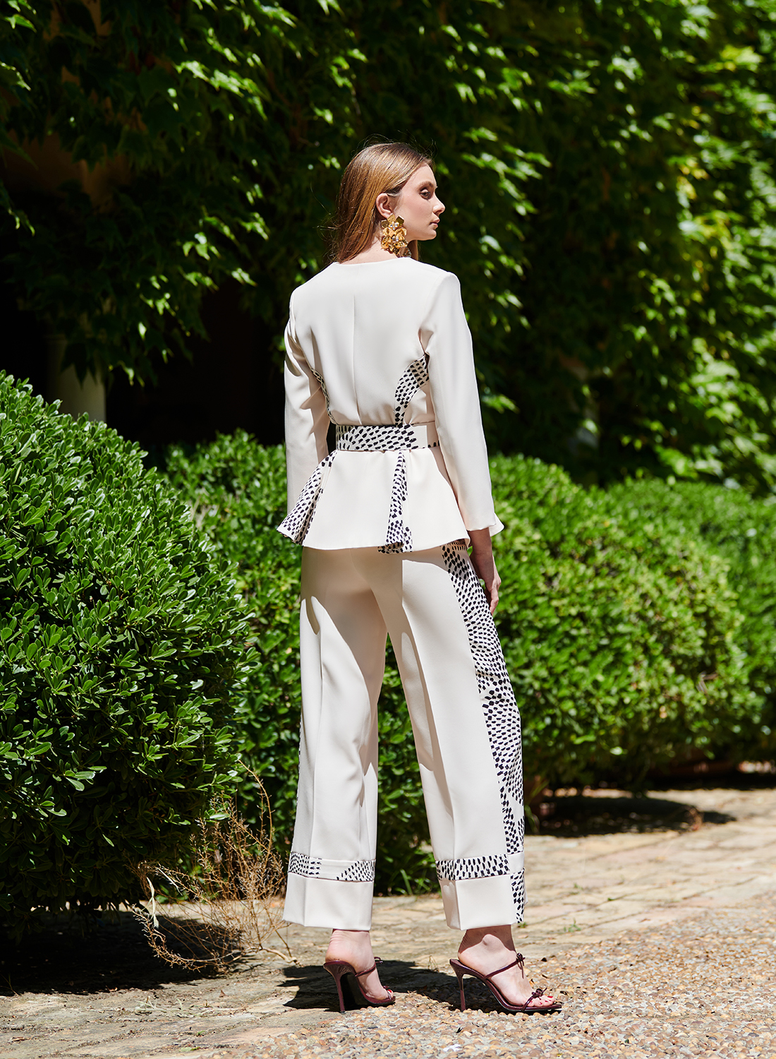 Descubre nuestro pantalón beige con detalles estampados en negro, una prenda exclusiva diseñada para mujeres que buscan elegancia, estilo y comodidad en sus eventos más especiales. Su patrón limpio y moderno se combina con franjas estampadas estratégicamente situadas, que estilizan la figura y aportan un toque sofisticado y actual.
