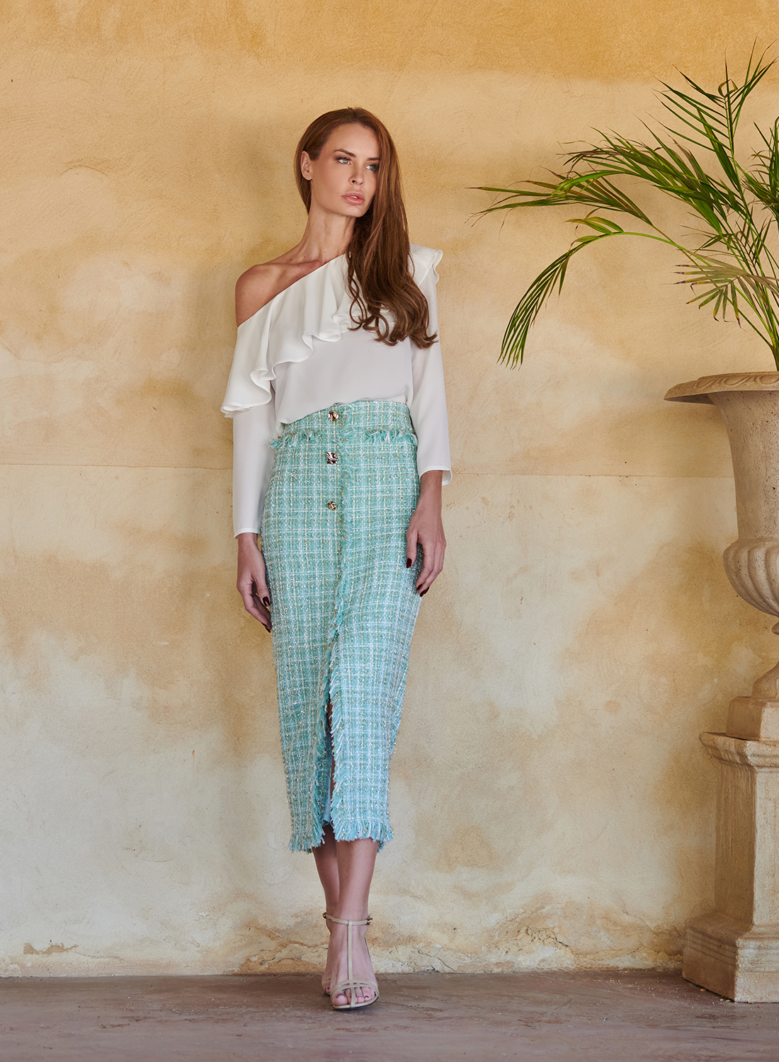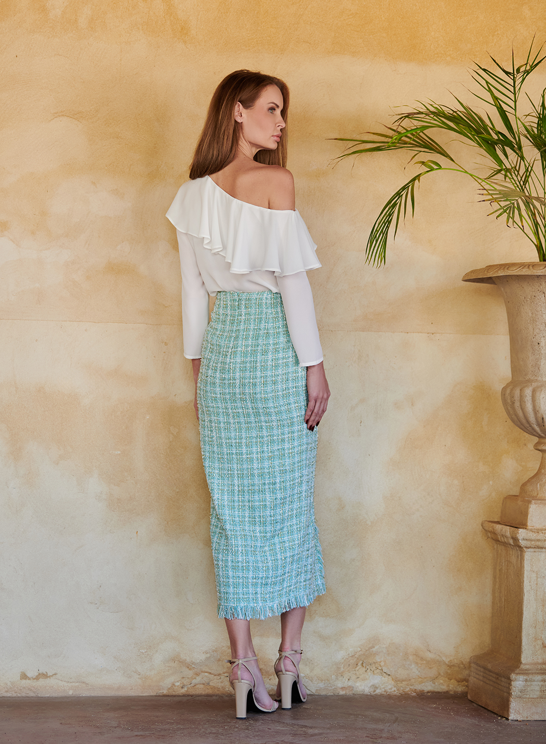 Combínalo con nuestra falda de estilo Chanel en tonos pastel, y conseguirás un conjunto de comunión lleno de estilo y personalidad. También puedes llevarlo con pantalones palazzo o faldas midi para otros eventos primaverales o de verano.