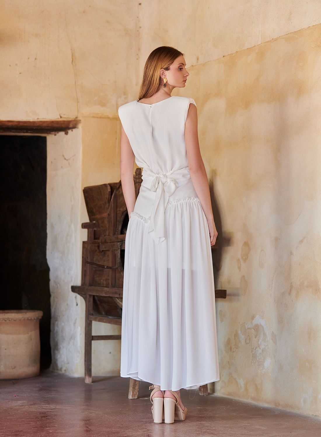 En la parte trasera, el lazo anudado añade un aire femenino y distinguido que convierte este top en una auténtica joya para cualquier look de invitada.