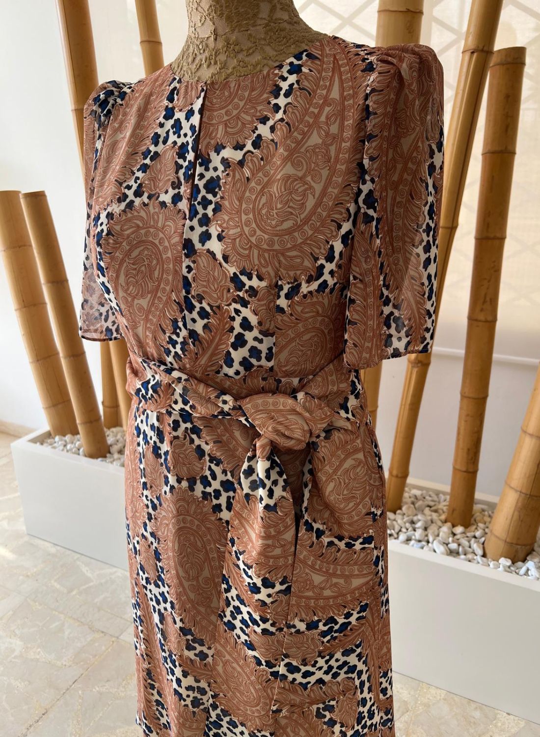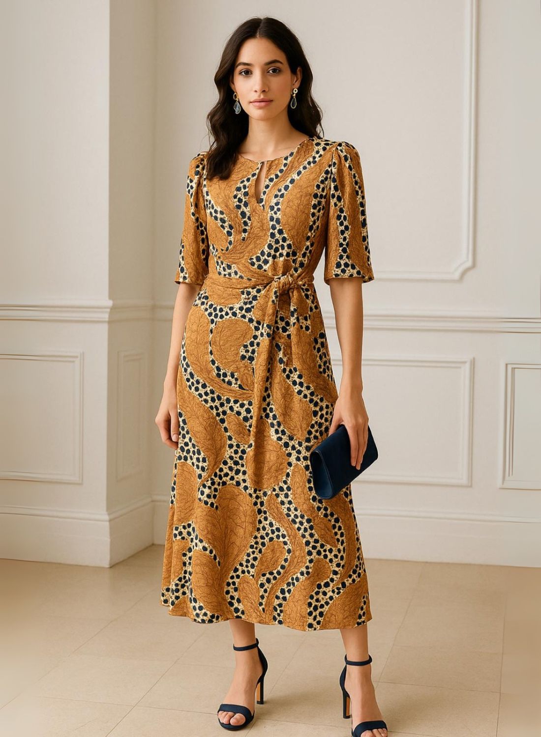 Si tienes una boda o evento esta temporada, este vestido es tu aliado perfecto. Su estampado elegante en tonos tierra con detalles únicos lo convierte en una prenda sofisticada y muy especial.