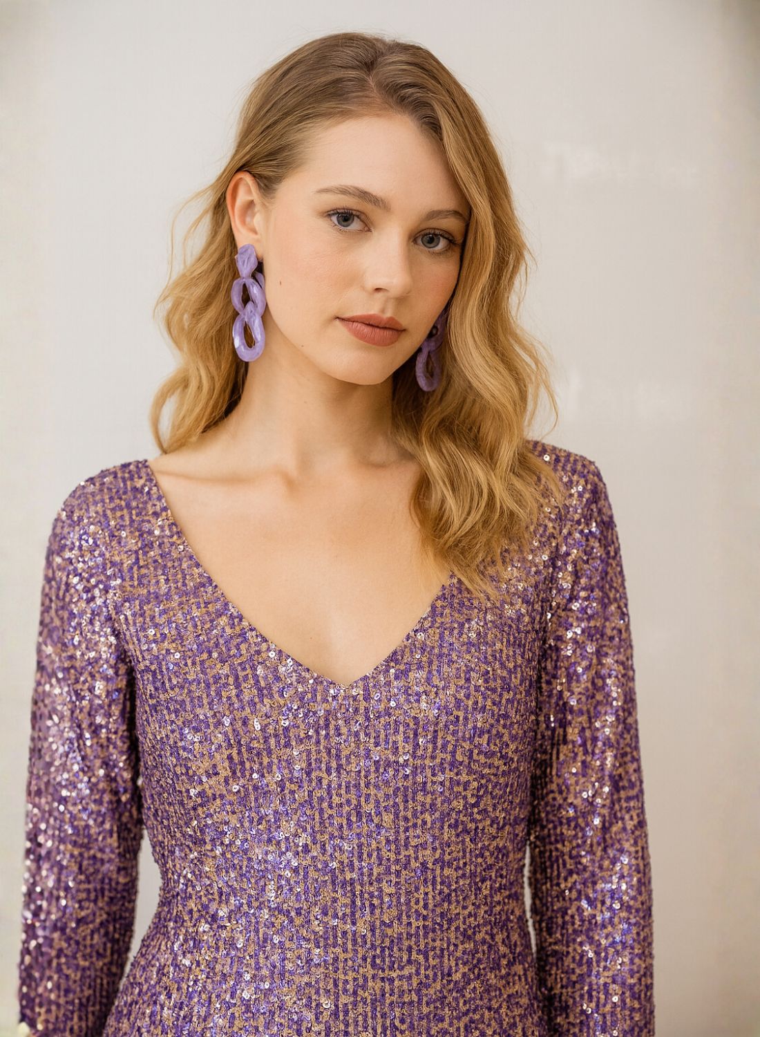 Vestido corto de fiesta con tejido de lentejuelas presentado en color morado.