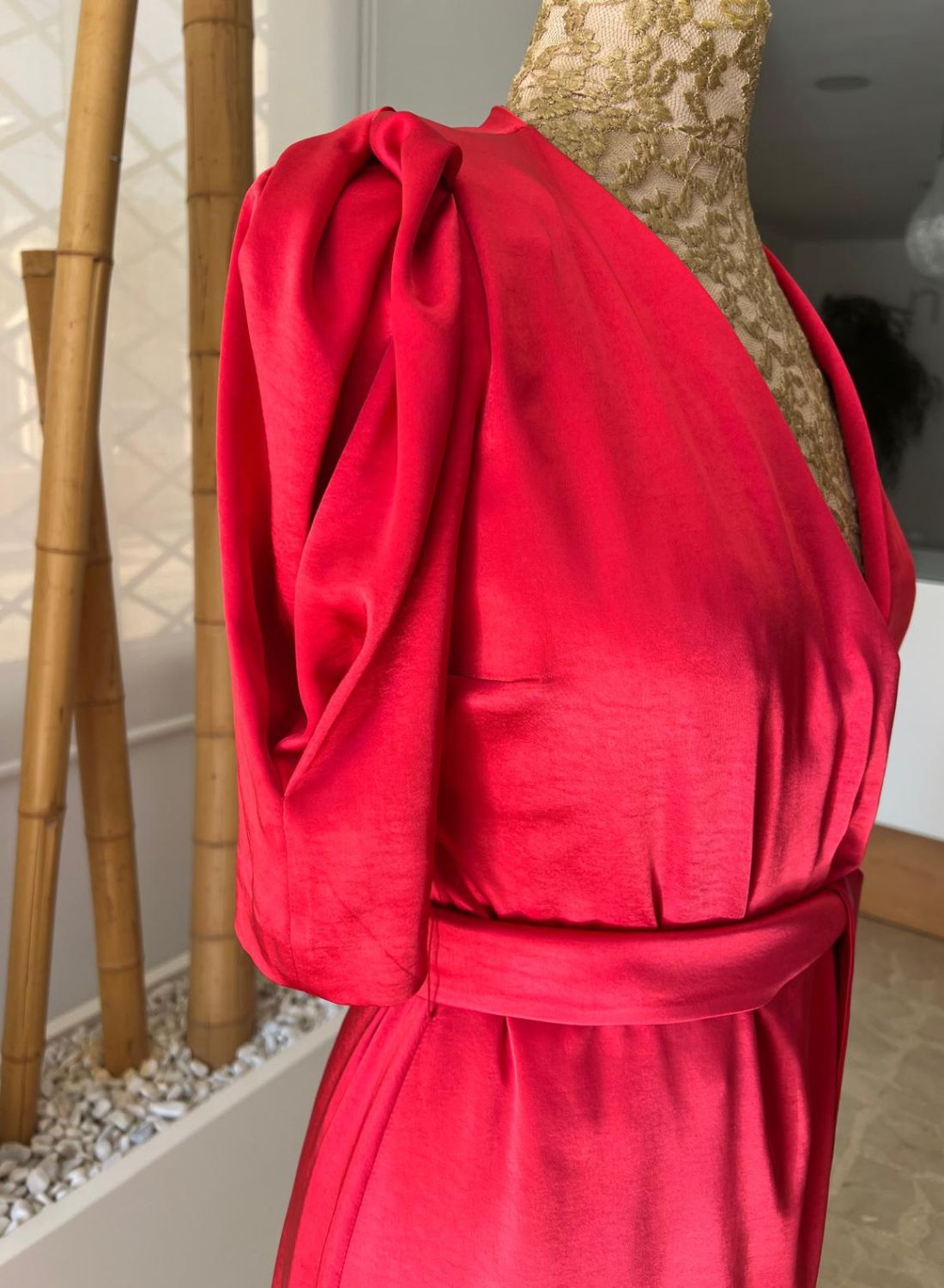 El escote en V y las mangas ligeramente abullonadas aportan un aire femenino y actual, perfecto para bodas de otoño, cenas especiales o celebraciones de noche. La falda larga con abertura delantera equilibra el glamour y la comodidad, permitiéndote moverte con total libertad.