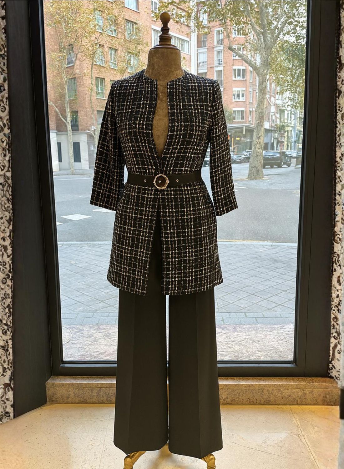 Vestido levita con cinturón en tejido chanel negro y blanco que combina estos dos colores de manera sofisticada, y el corte le da un toque distintivo. Este tipo de vestido suele ser atemporal y puede ser una opción perfecta para ocasiones formales.