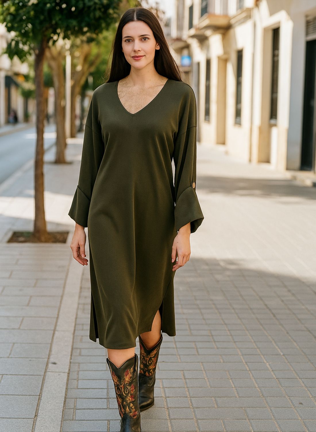 Vestido largo de punto color verde oscuro con dobladillo en mangas y detalle de botón dorado.