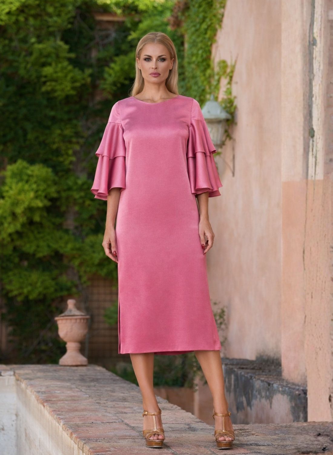 Este vestido midi rosa para invitadas destaca por su diseño minimalista con un giro sofisticado: sus mangas con volantes en capas, que aportan movimiento, estilo y ese aire exclusivo que tanto se busca en eventos especiales.