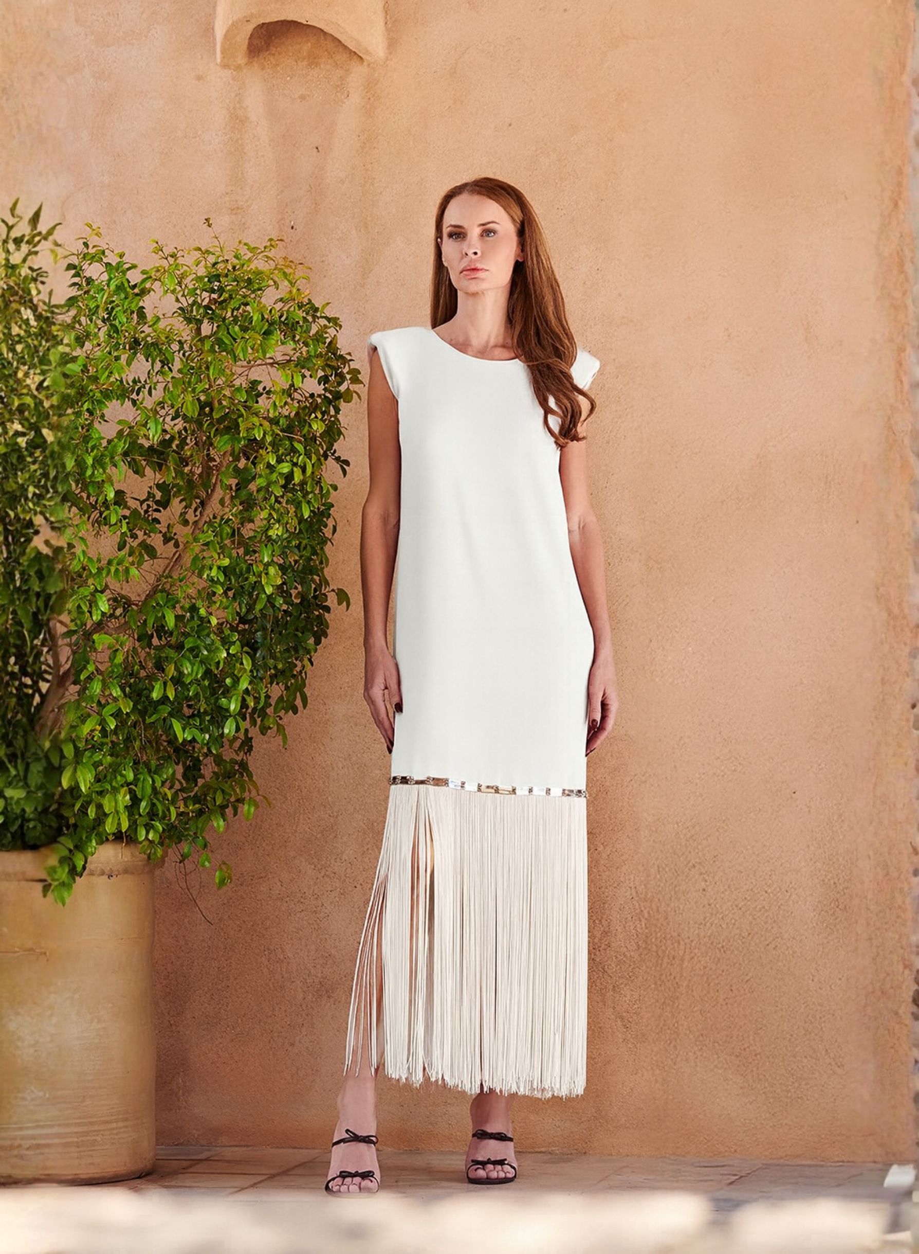 Este vestido es una opción perfecta para invitadas de comunión, mamás de comunión, bautizos, celebraciones familiares y cualquier ocasión donde quieras destacar sin renunciar a la comodidad. Los flecos en el bajo estilizan la figura y añaden un efecto visual muy favorecedor al caminar, convirtiéndolo en una pieza única y diferente dentro de los vestidos y conjuntos para eventos.